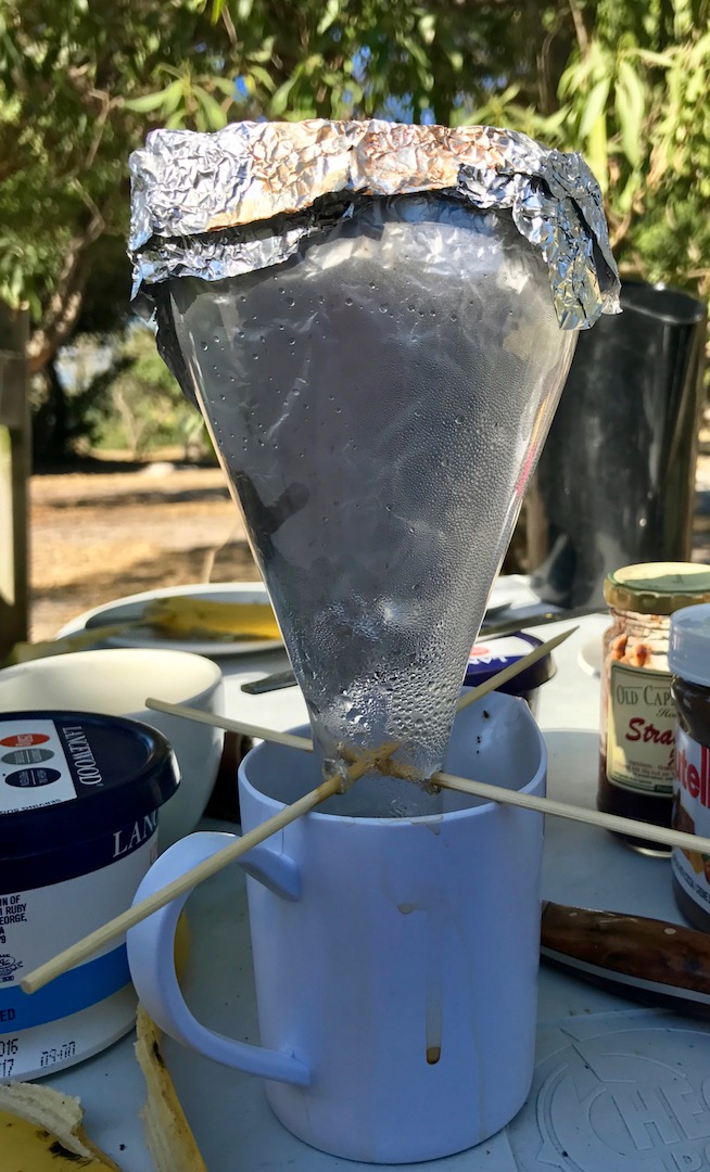 img_0518 20. Januar 2017 • 654 × 1080 • Hit the road… Unsere Kaffeemaschine. Abgeschnittene Wasserflasche, Alufolie, Schaschlikspieße, Papierfilter rein und fertig.
